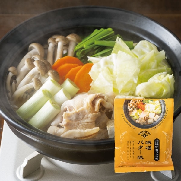 ・味噌バター・・「アコメヤの出汁野菜」 を使用した野菜の旨味引き立つ鍋つゆ。 米味噌のコクとバターの風味が特徴です。隠し味に酒粕を加え、濃厚で旨味のある鍋つゆに仕上げました。