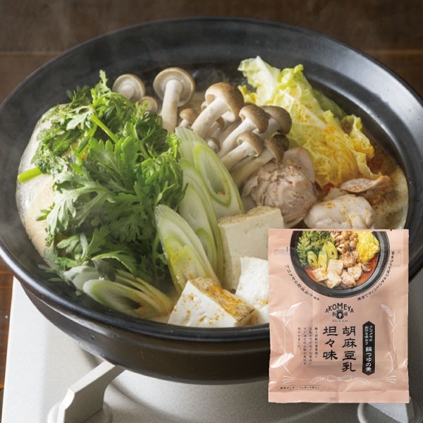 ・胡麻豆乳坦々・・「アコメヤの出汁 野菜」を使用した。野菜の旨味引き立つ鍋つゆ。練り胡麻の濃厚感と豆乳のマイルドな甘み、ラー油と花山椒の風味が特徴。 隠し味に豆板醤と米味噌を加え、奥深い味わいに仕上げました。