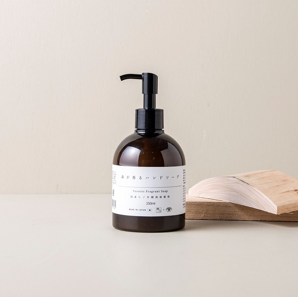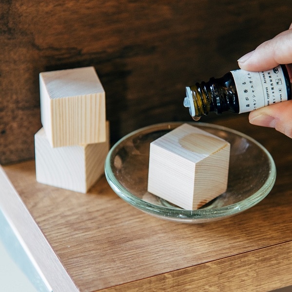 「森が香る」シリーズのハンドソープ、ホットアイマスク、エッセンシャルオイル、アロマブロックの4点セット。エッセンシャルオイルは、アロマブロックに染みこませることで、様々な場所で天然のアロマディフューザーとしてお使いいただけます。