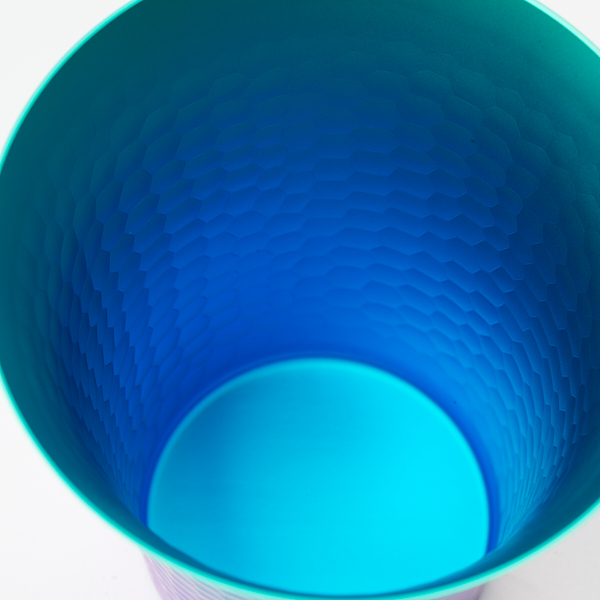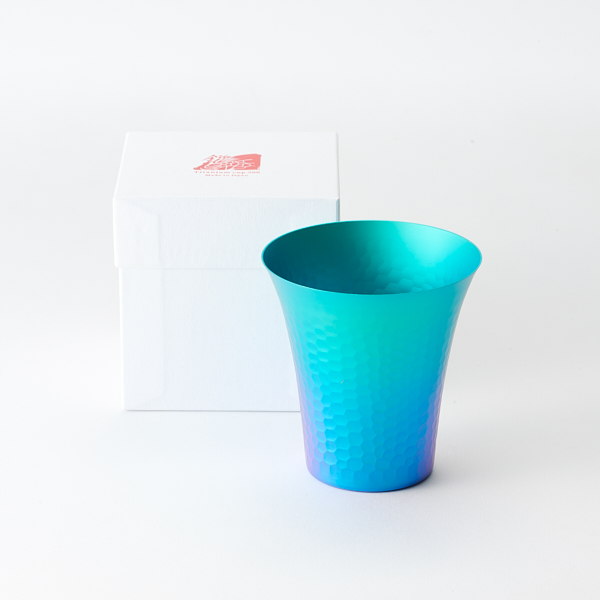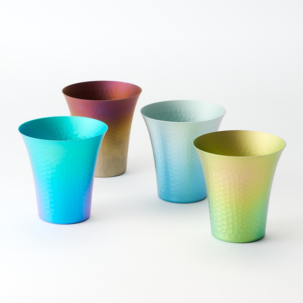 - 洗練されたデザインと美しい鎚目加工が印象的な、チタン製のカップ。