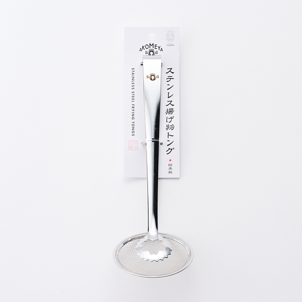 カス揚げ網とトングが合体した、ステンレス製の揚げ物トング。