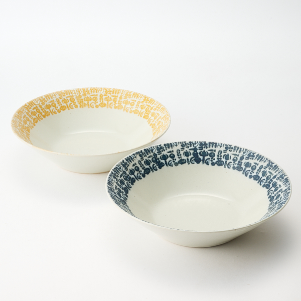 また、本シリーズは4種類全ての形状をオリジナルで設計しています。スタッキングのしやすさや生活に溶け込むアイテムにこだわり、毎日食卓に登場するお気に入りの器を目指しました。また、陶器の素材に20%程磁器の素材をブレンドして作ることで、陶器の温かみを残しつつ、しっかり硬質に焼けた器に仕上げています。カラーはそれぞれの形毎にネイビーとイエローの2色でご用意。ご自宅用としては勿論、ご結婚や新居祝いの贈り物にしても喜ばれます。