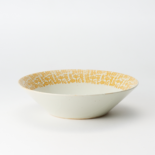 印判は、判子を一つ一つ手で押しして模様を作っていく技法で、江戸時代から続く伝統技法です。江戸時代にはゴムもスポンジもなかったため、当時は蒟蒻判といって蒟蒻を原料に作っていたそう。勲山製陶の窯主は、その伝統的なの印判の技法に一工夫をいれ、エンボスのような凹凸を器に表現することに成功しました。手押しならではの微妙なカスレやズレ。人の手が作り出す「揺らぎ」や手作業の温かみが勲山製陶の器の魅力です。