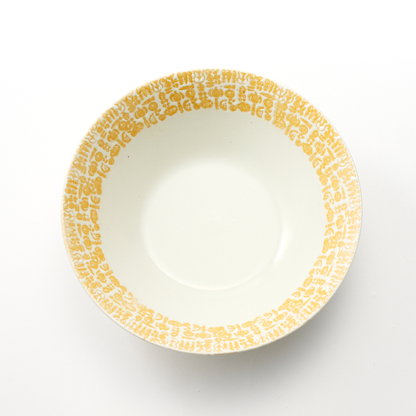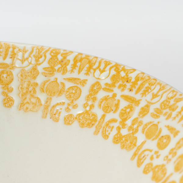 - 人参やレンコンなどのさまざまな野菜の柄が施された、アコメヤでは珍しい洋食にも合う波佐見焼の器。