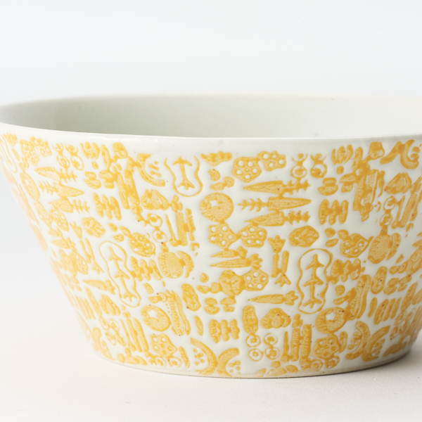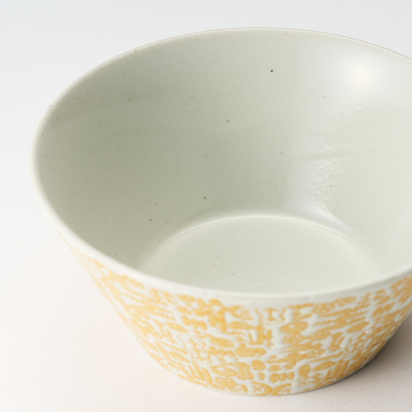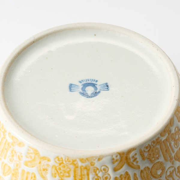 印判は、判子を一つ一つ手で押しして模様を作っていく技法で、江戸時代から続く伝統技法です。江戸時代にはゴムもスポンジもなかったため、当時は蒟蒻判といって蒟蒻を原料に作っていたそう。勲山製陶の窯主は、その伝統的なの印判の技法に一工夫をいれ、エンボスのような凹凸を器に表現することに成功しました。手押しならではの微妙なカスレやズレ。人の手が作り出す「揺らぎ」や手作業の温かみが勲山製陶の器の魅力です。