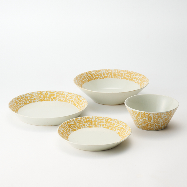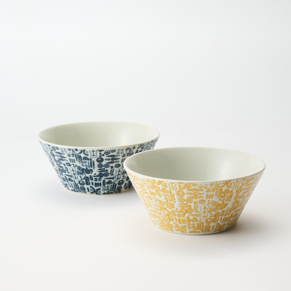 また、本シリーズは4種類全ての形状をオリジナルで設計しています。スタッキングのしやすさや生活に溶け込むアイテムにこだわり、毎日食卓に登場するお気に入りの器を目指しました。また、陶器の素材に20%程磁器の素材をブレンドして作ることで、陶器の温かみを残しつつ、しっかり硬質に焼けた器に仕上げています。カラーはそれぞれの形毎にネイビーとイエローの2色でご用意。ご自宅用としては勿論、ご結婚や新居祝いの贈り物にしても喜ばれます。