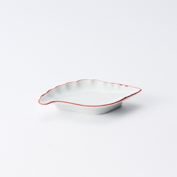 こちらは、アコメヤの別注品で、シンプルな白磁に渕赤を施した、食材を引き立ててくれる上品なお皿。巻貝には願い事を叶える力があると信じられていたことから、紀願成就の縁起柄とされています。