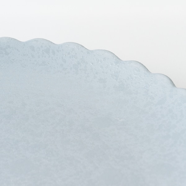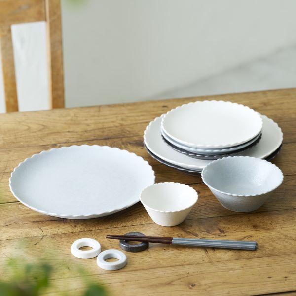 シックなモノトーンですが、釉薬をランダムに散らすことで、奥行きのある表情となり、水滴にも見える釉薬が食材に瑞々しい印象を与えてくれます。ベーシックな黒、白に加え、アコメヤのために色出ししていただいた限定色グレーの3色展開。フリルをイメージした渕の波の曲線がシックな中にも可愛さを演出してくれます。シンプルなデザインとカラー展開なので和洋問わずに使いやすくデイリーに活躍します。型違い、サイズ違いで揃えておくとテーブルに統一感が生まれます。