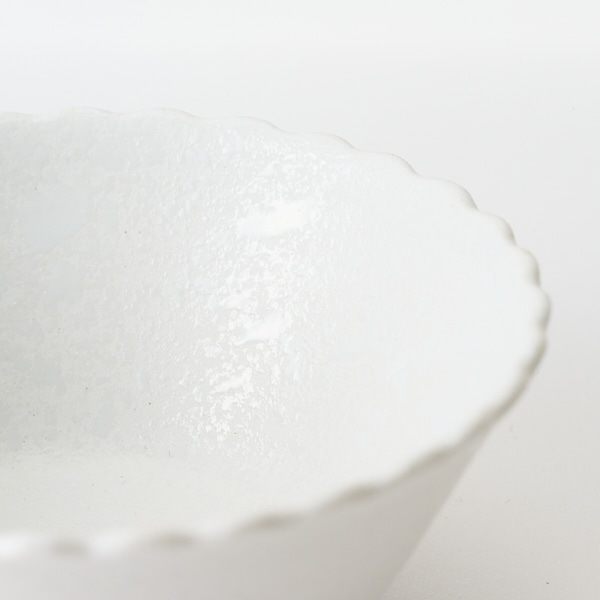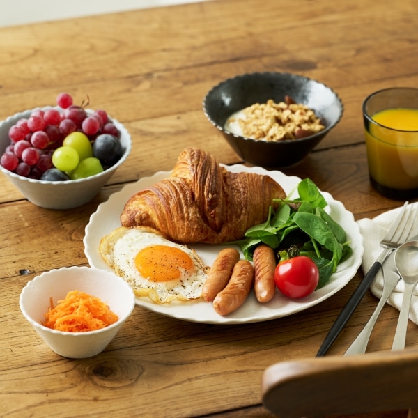 シックなモノトーンですが、釉薬をランダムに散らすことで、奥行きのある表情となり、水滴にも見える釉薬が食材に瑞々しい印象を与えてくれます。ベーシックな黒、白に加え、アコメヤのために色出ししていただいた限定色グレーの3色展開。フリルをイメージした渕の波の曲線がシックな中にも可愛さを演出してくれます。シンプルなデザインとカラー展開なので和洋問わずに使いやすくデイリーに活躍します。型違い、サイズ違いで揃えておくとテーブルに統一感が生まれます。