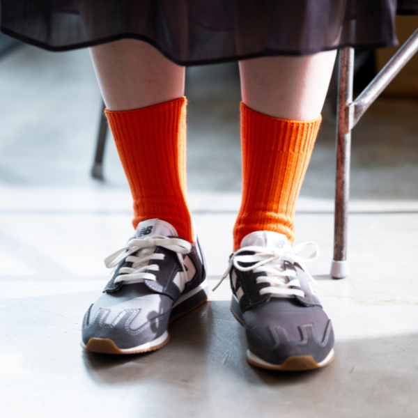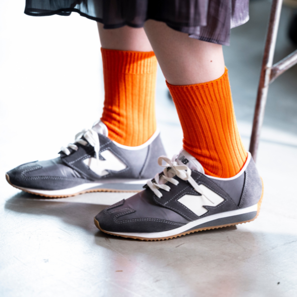 カラーは、デイリーに使いやすい、ホワイトとグレー、足元のアクセントカラーに最適なオレンジの3色展開。サイズはユニセックスでご利用いただけるようM・Lの2サイズご用意しています。ちょっとしたギフトにもおすすめです。