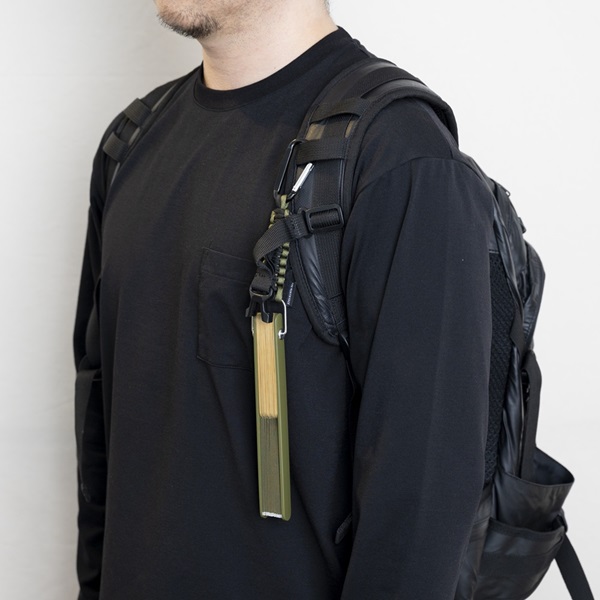 アウトドアシーンに便利なカラビナ付きの扇子。
