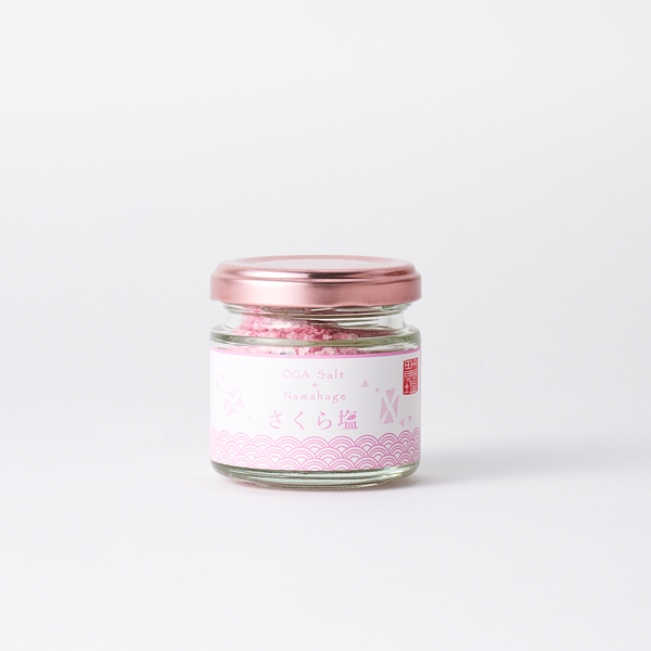 - 男鹿沖の海水を釜で焚く昔ながらの製法で丹精込めて作った男鹿半島産の塩に、ほのかな桜葉の香りを付けた、さくら風味の塩。