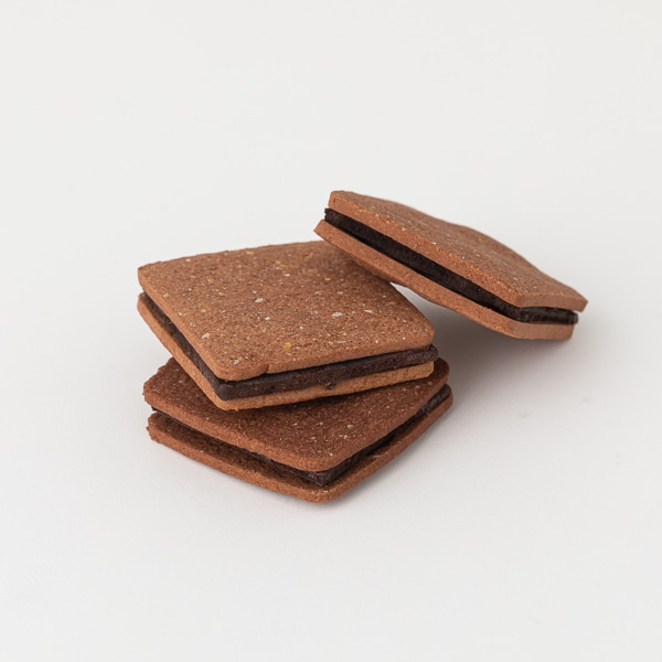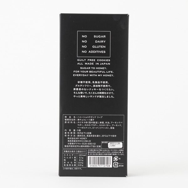 - シュガーフリー(白砂糖不使用)・グルテンフリー(小麦粉不使用)・ケミカルフリー(化学物質不使用)・デイリーフリー(乳製品不使用)。甘さは低GI(28)の生はちみつだけ、の1枚ずつ手作りで仕上げた罪悪感のないチョコレートサンド。