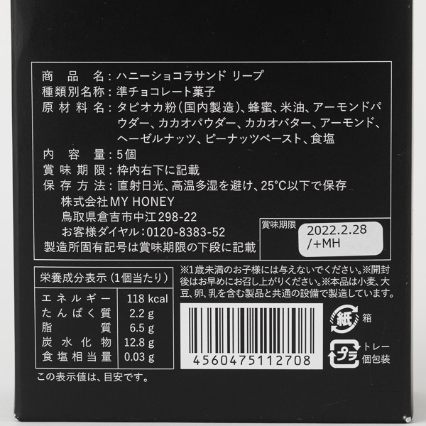 - タピオカ粉(国内製造)、蜂蜜、米油、アーモンドパウダー、カカオパウダー、カカオバター、アーモンド、ヘーゼルナッツ、ピーナッツペースト、食塩