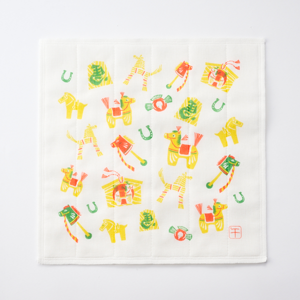 台拭きやタオルとして、また毛羽立ちしにくいのでグラスを拭くときにも役立ちます。 2026年の干支「午」と吉祥モチーフを盛り込んだおめでたいふきんです。新年の新調用に、お年賀ギフトに。