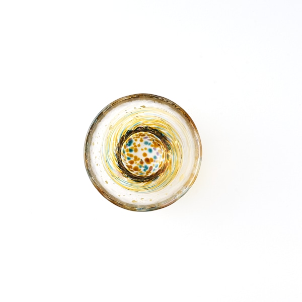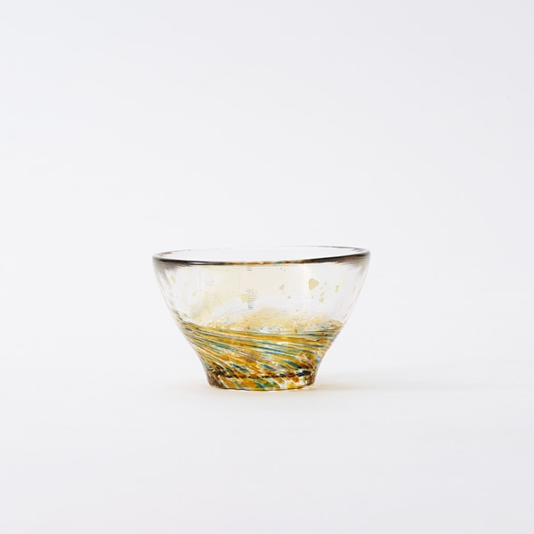 - どこか懐かしくほっとするアンバーの色調に青の線がきいている、アコメヤオリジナルの津軽びいどろの盃。