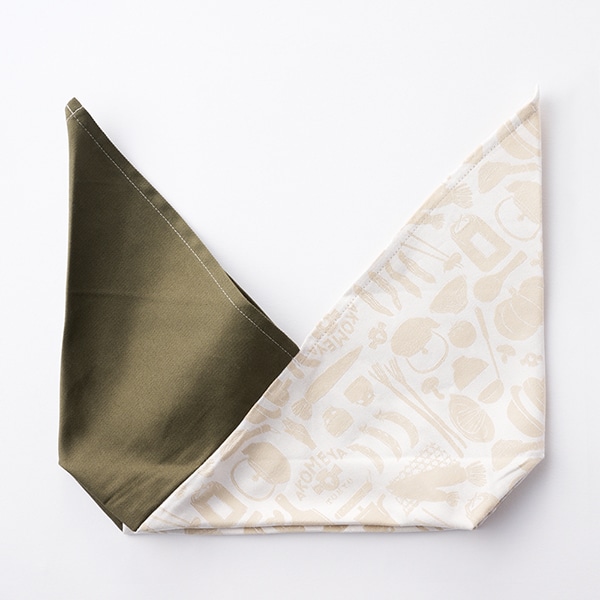 柄の部分は、プリントではなく、先染め生地の有名な産地である兵庫県播州地方で別注生産をしたブランドオリジナルのコットンジャカード素材を使用し、コットン無地生地との組み合わせています。アコメヤに並ぶ様々な食道具や食材をちりばめた、ランチタイムが楽しくなるような他にはないデザインです。
