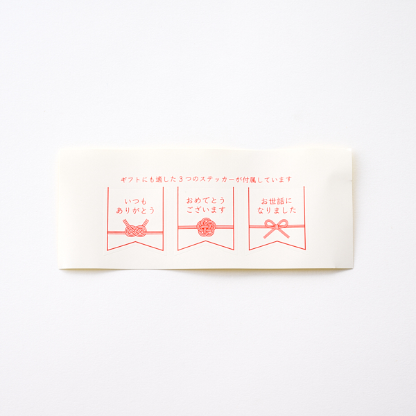 「いつもありがとう」「おめでとうございます」「お世話になりました」の3種のメッセージのステッカーが付属しているので、ちょっとしたお礼やご挨拶用のプチギフトとしても重宝します。贈るシーンに合わせてステッカーをセレクトしてご活用ください。