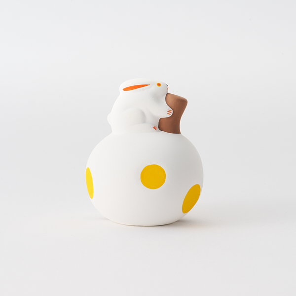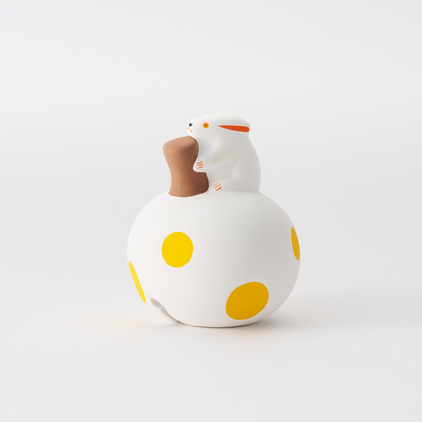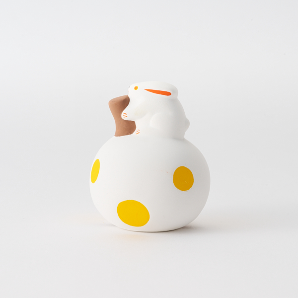 うさぎは、ぴょんぴょん飛び回ることから「飛躍する」、長い耳からは「自分の身を守る情報を集める」と言われ、成長や発展を祈願する商売繁盛の縁起物として親しまれてきました。餅つきが得意なうさぎが、月ごとドンと突くことで「月=ツキ=運」を力強く呼び寄せます。