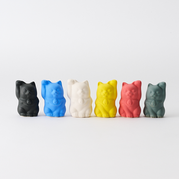 マット釉薬を使用した、艶のないざらざらした(マットな)質感の招き猫。色によって「ご利益」が違います。招き猫は白猫か三毛猫が一般的でしたが、近年では風水の要素を取り入れた様々な色の招き猫が登場。白や三毛の招き猫のご利益がオールマイティな「開運招福」なのに対し、そのほかの色は時代を反映した様々な運を招いています。お好みやインテリアの雰囲気に合わせてこれぞというものをお選びください。
