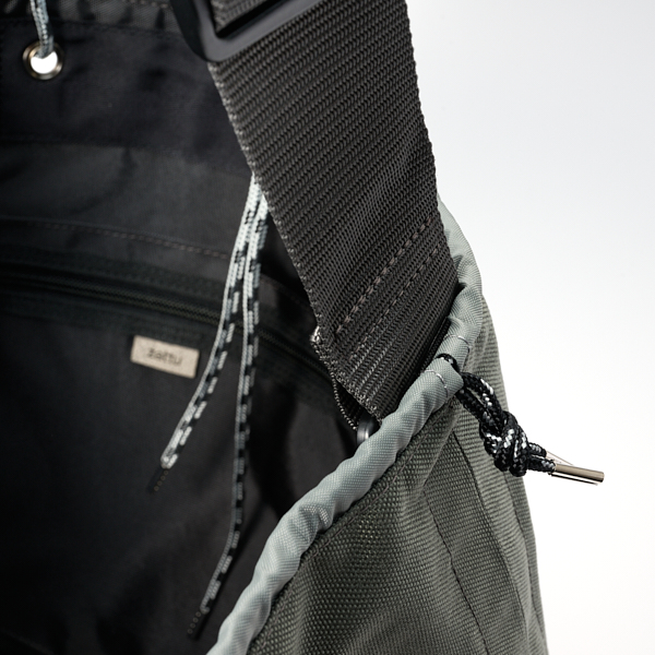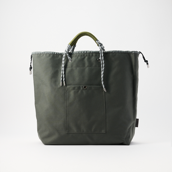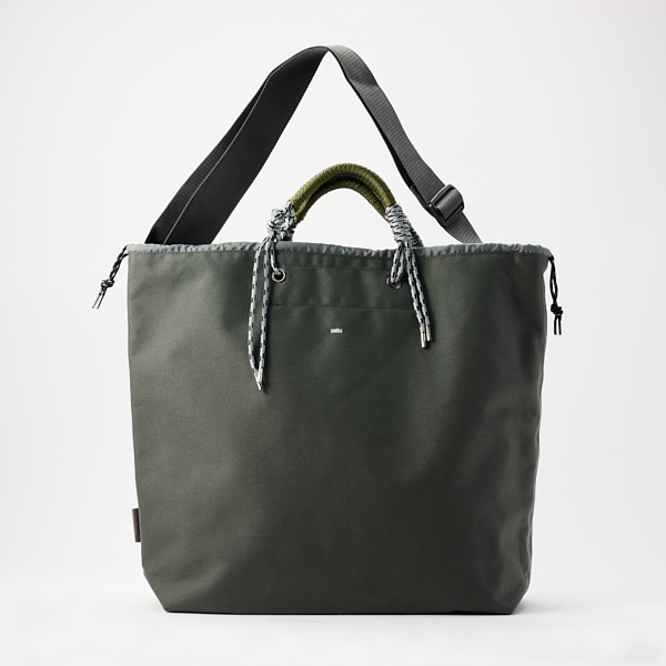 コードを編み上げた太目のハンドルがポイント。幅の広いショルダーは荷物の負担を軽減します。ドローコードを通した開口部は絞れる仕様になっているので荷物を全開にしたくない時も安心です。