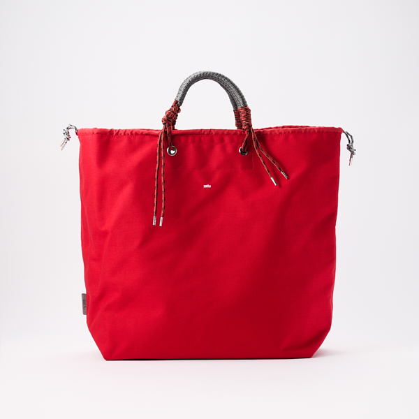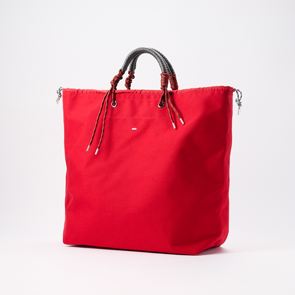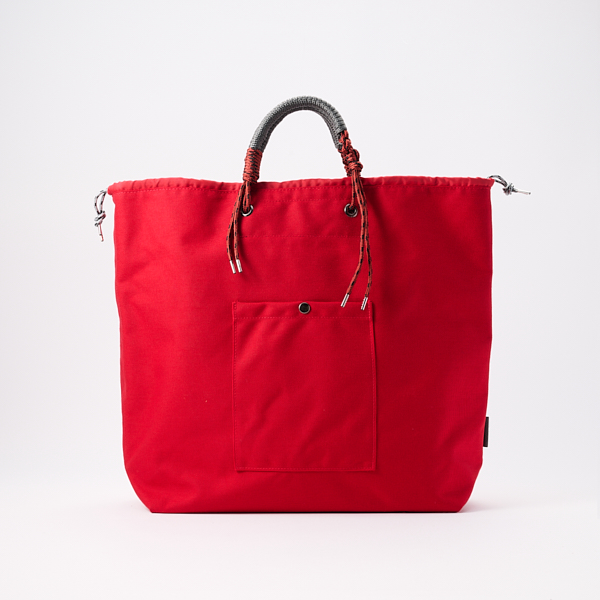 コードを編み上げた太目のハンドルがポイント。幅の広いショルダーは荷物の負担を軽減します。ドローコードを通した開口部は絞れる仕様になっているので荷物を全開にしたくない時も安心です。