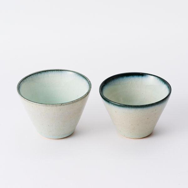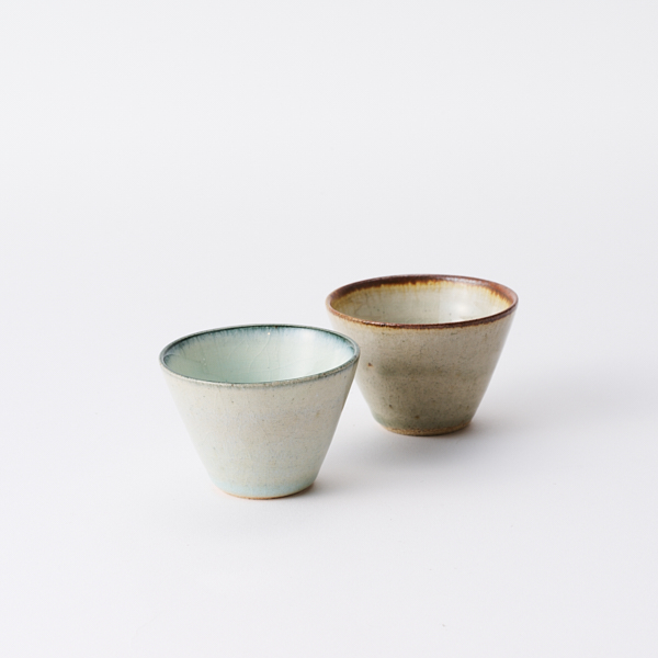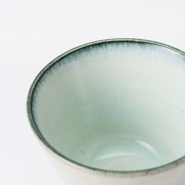 貫入の表情が美しい土灰ベースの青磁灰釉と、白の中にほんのり青さがでる青萩釉は隆月窯さんご自身で調合された釉薬。共に内側は粉引をすることで釉薬の色がよりきれいに見えるようになっているのが特徴です。
