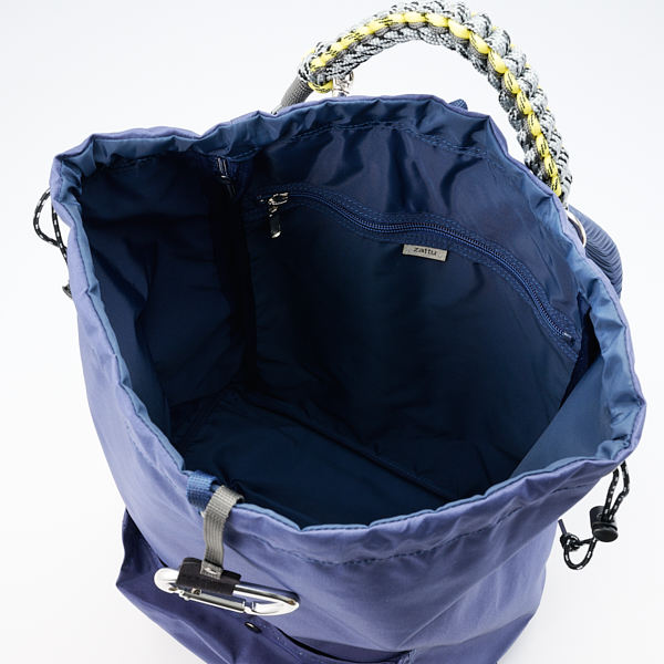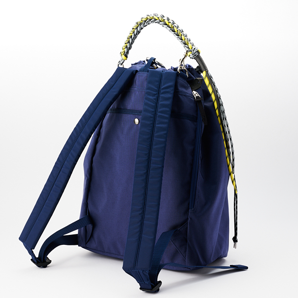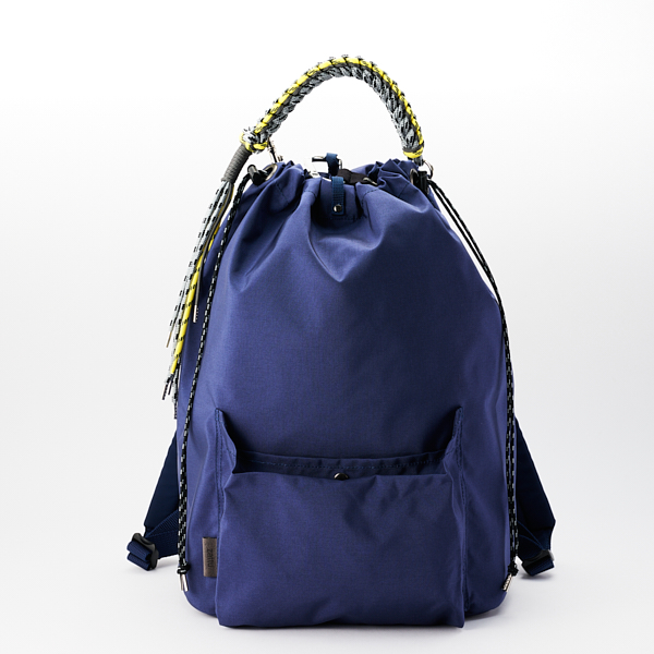 - タフで軽量、マット感のあるナイロンを使用し、カラフルなコードで編んだハンドルが特徴的なシングルポケット付き巾着型バッグパック。上部の開閉口に付いた大きなカラビナは、背面のループに通すことでロック機能になります。本体のサイドにあるファスナーから簡単に中のものが取り出せます。
