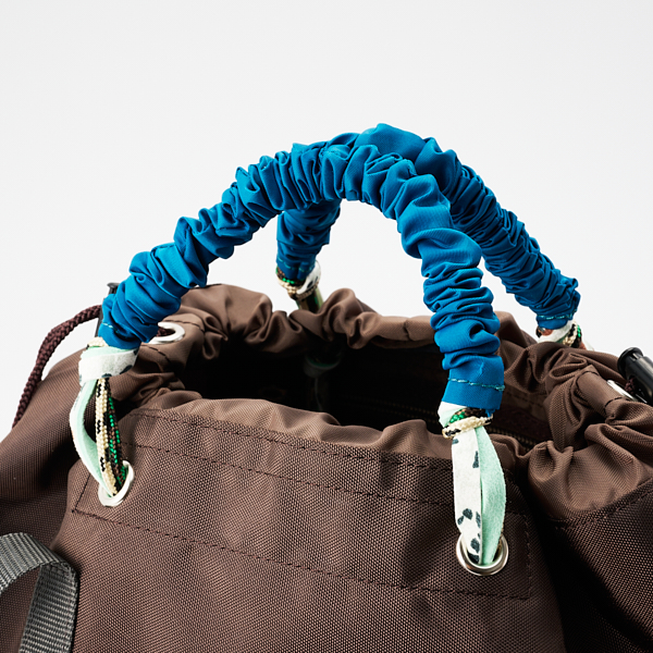 - 軽量でハリのあるナイロンを使用し、コードとマイクロファイバースエードを束ねたハンドルと肩掛け用のテープショルダーが付いた2WAYスモールトートバッグ。
