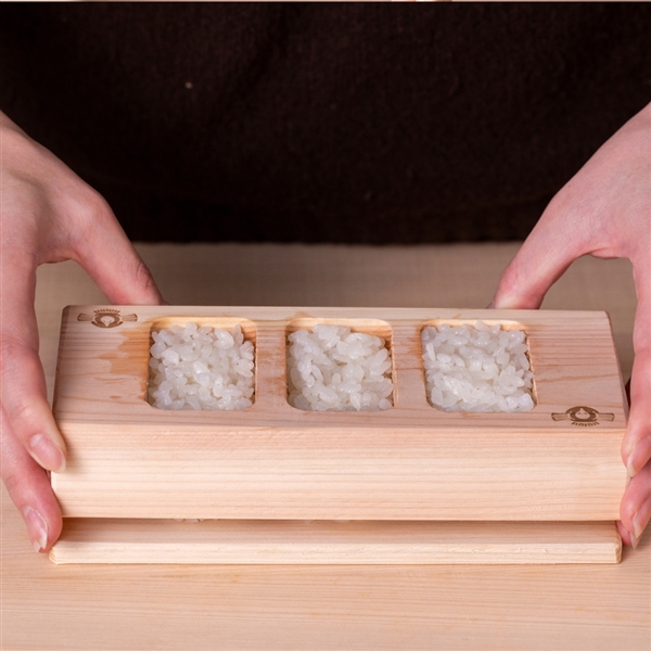 ヒノキの木の型が余分な水分を吸収し、ご飯をより理想的な味にします。美味しく炊けたご飯も水蒸気のある状態でそのままにしておくと、しだいに粘りを失い、ナマの状態にもどっていきます。この現象は米の澱粉の老化によるもの。木の型を使うことで、それを防いでくれます。また、出来上がったおにぎりにはヒノキの香りがほんのり移り、食欲をそそるものに。