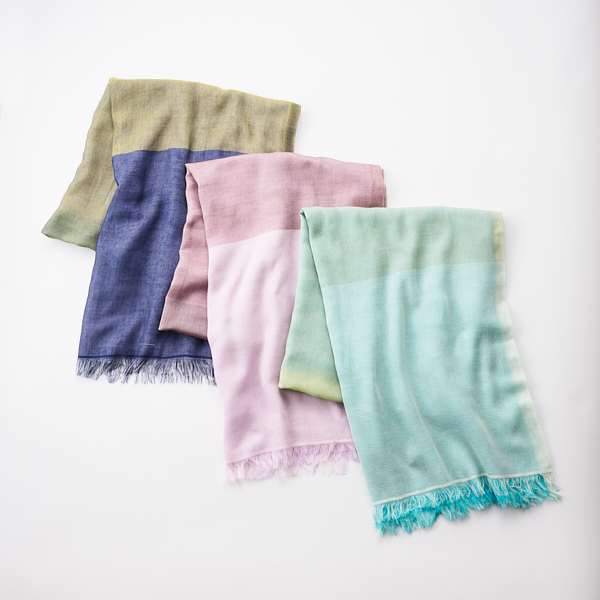 大判サイズのため、ストールとしてはもちろん、ひざ掛けなど幅広く活躍します。今治の美しい自然や風景をイメージした、色の透け感と重なりを楽しめる配色です。