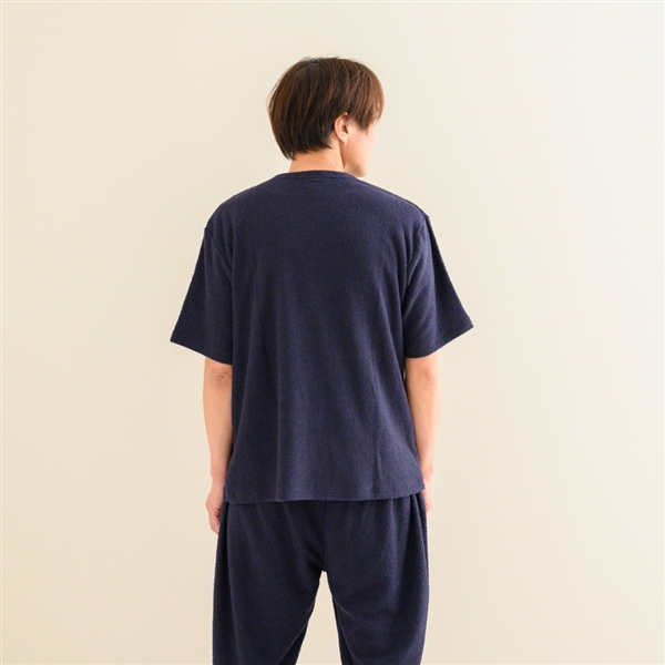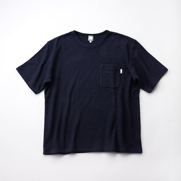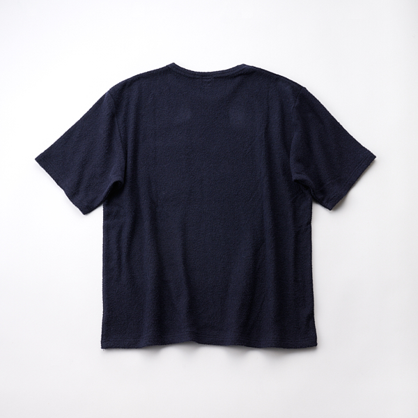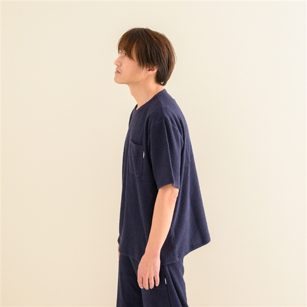こちらは夏場のルームウェアとして重宝する、クルーネックの半袖プルオーバー。デザインのアクセントとして左胸にパッチポケットをあしらっています。