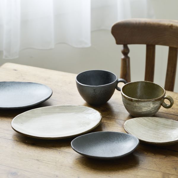 窯の中で炎と出会い黒い結晶を作り上げる「黒銀彩」。シンプルな色の中に味わいのある窯変(釉薬の色の変化)が魅力で、食材を引き立ててくれる色合いです。