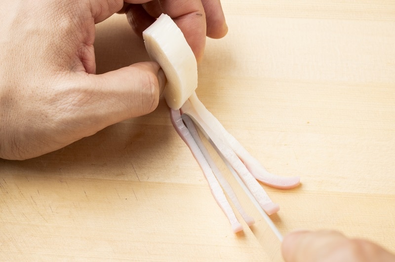 かまぼこを12mmほどの厚さに切ります。次に表面を2mmほどの厚さで切り、端は1.5cmほど残します。