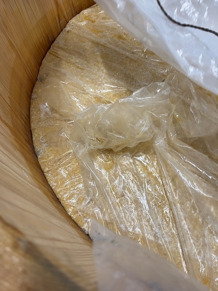 また、桶を洗った後の香りも1年目は木桶の香りだけだったのが、2年目は木桶の香りもありつつ、味噌の香りも残り始めていて、徐々に木桶が当蔵に染まり始めているように感じています。