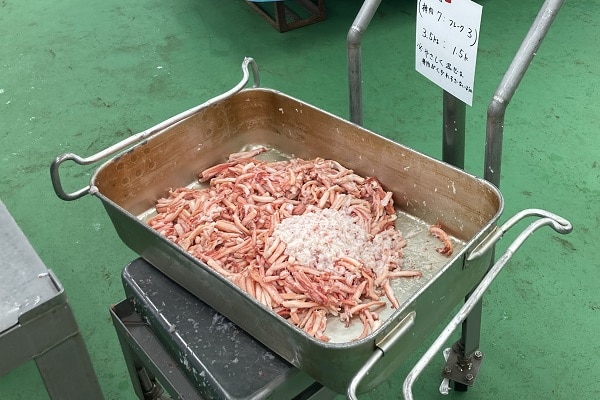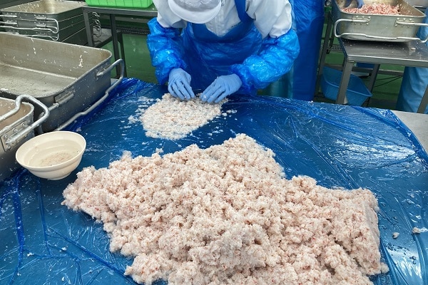 また蟹のフレークには、貝殻など海の不純物が入ってしまい、それらは金属探知機やX線の検査に反応しないため、目視手作業で検品を行い、丁寧に取り除いたのち、棒肉とフレークを、かたちを崩さないようにていねいに手作業で混ぜ合わせています。