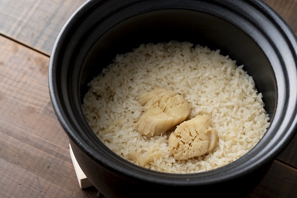 「帆立めし」は、帆立の旨みと食感にこだわり、国産の大粒帆立の貝柱を厳選して使用しました。ごろっと入った肉厚な帆立が風味豊かに香ります。帆立エキスも使用し、帆立本来の旨みを存分にお愉しみいただけるよう仕上げました。