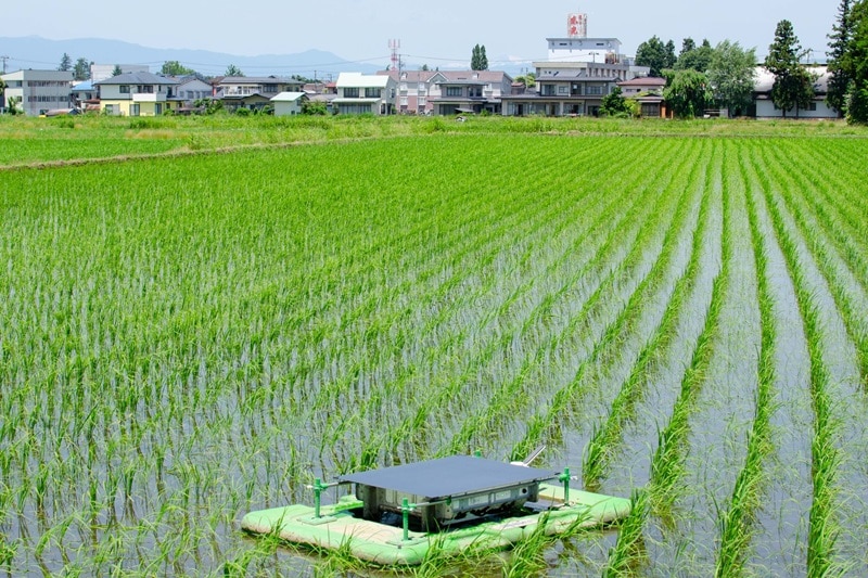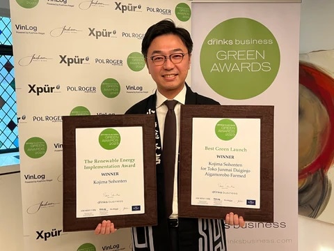 そこで登場したのが、「アイガモロボ」。ソーラーパネルとGPS機能を搭載し、太陽光発電で指定ルートを動きながら田んぼの水をスクリューで撹拌することにより、水が濁り日光を遮断し、田の土から雑草が生えないようにしつつ稲だけに日光が当たります。また土を撹拌することにより、田んぼから出る温室効果ガスであるメタンガスの発生も抑えます。この「アイガモロボ」によるスマート農業で、農薬不使用の酒米を契約農家と育て、酒造りに活かす取り組みをしています。