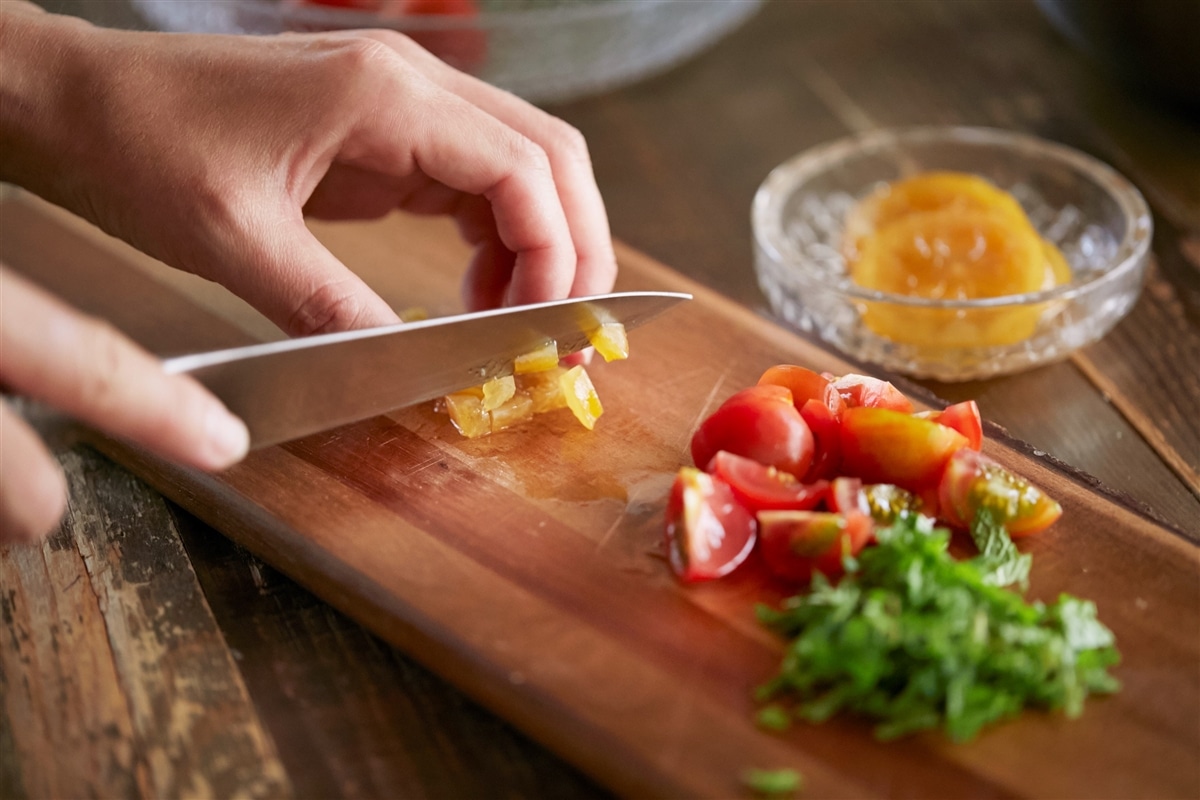ミニトマトは1/4に、スペアミントとレモンのコンフィチュールは粗みじん切りにする。
