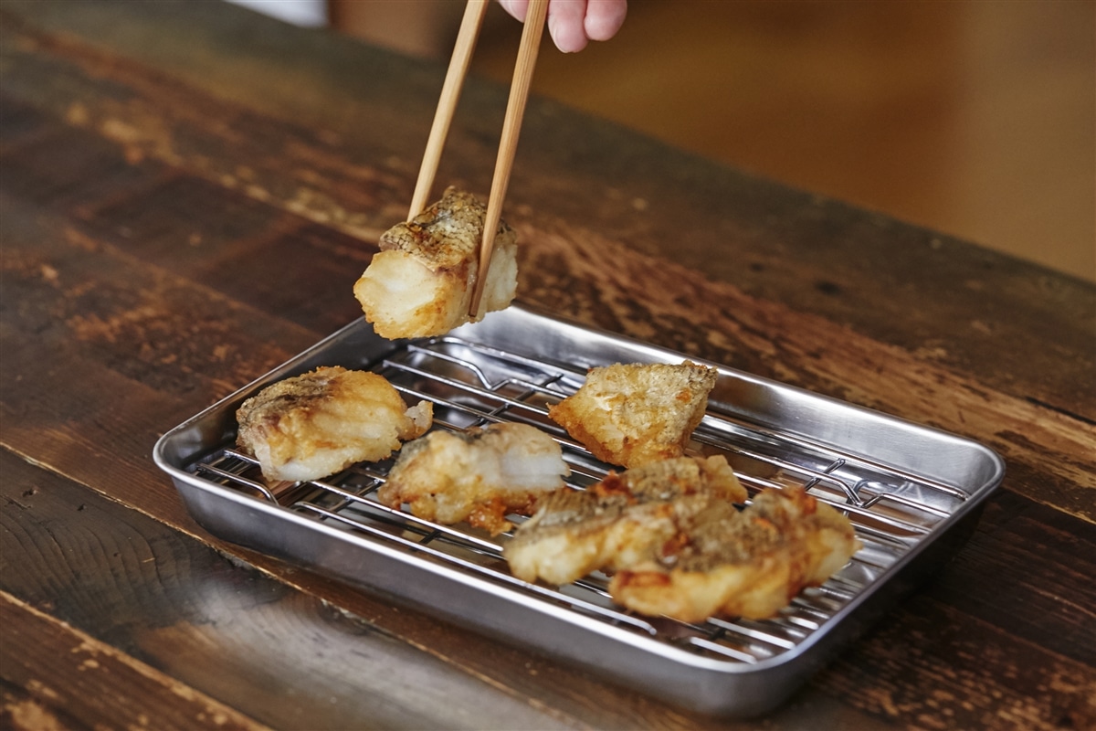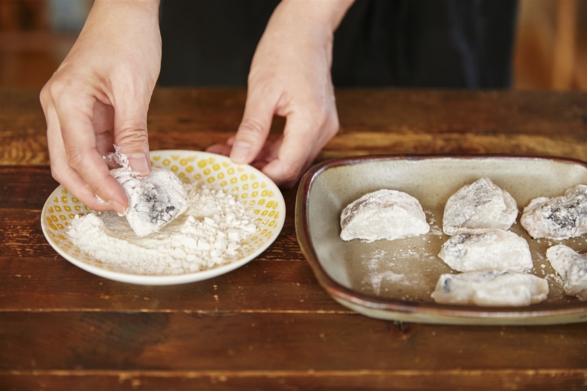 白身魚は骨を取ってひと口大に切り、軽く塩を振ってから小麦粉をまぶす。