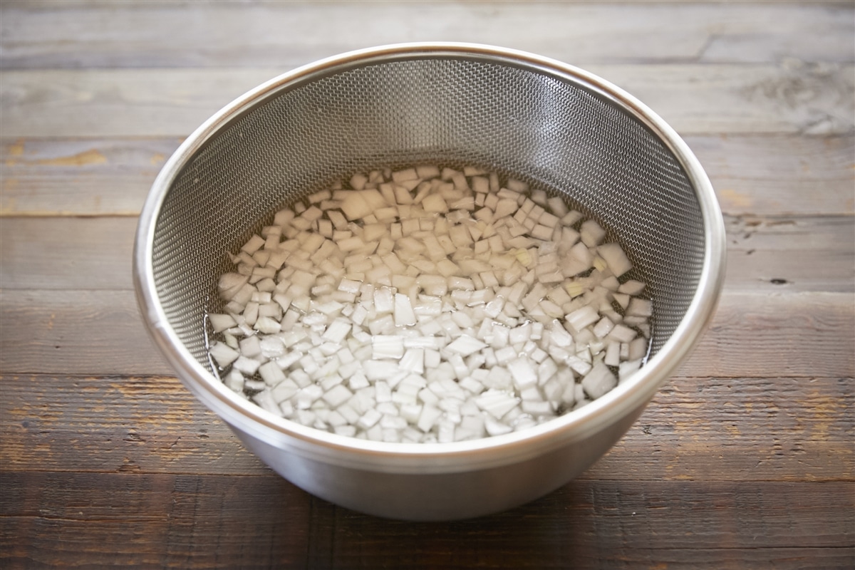 新玉ねぎは粗くみじん切りにして、5分ほど水にさらしておく