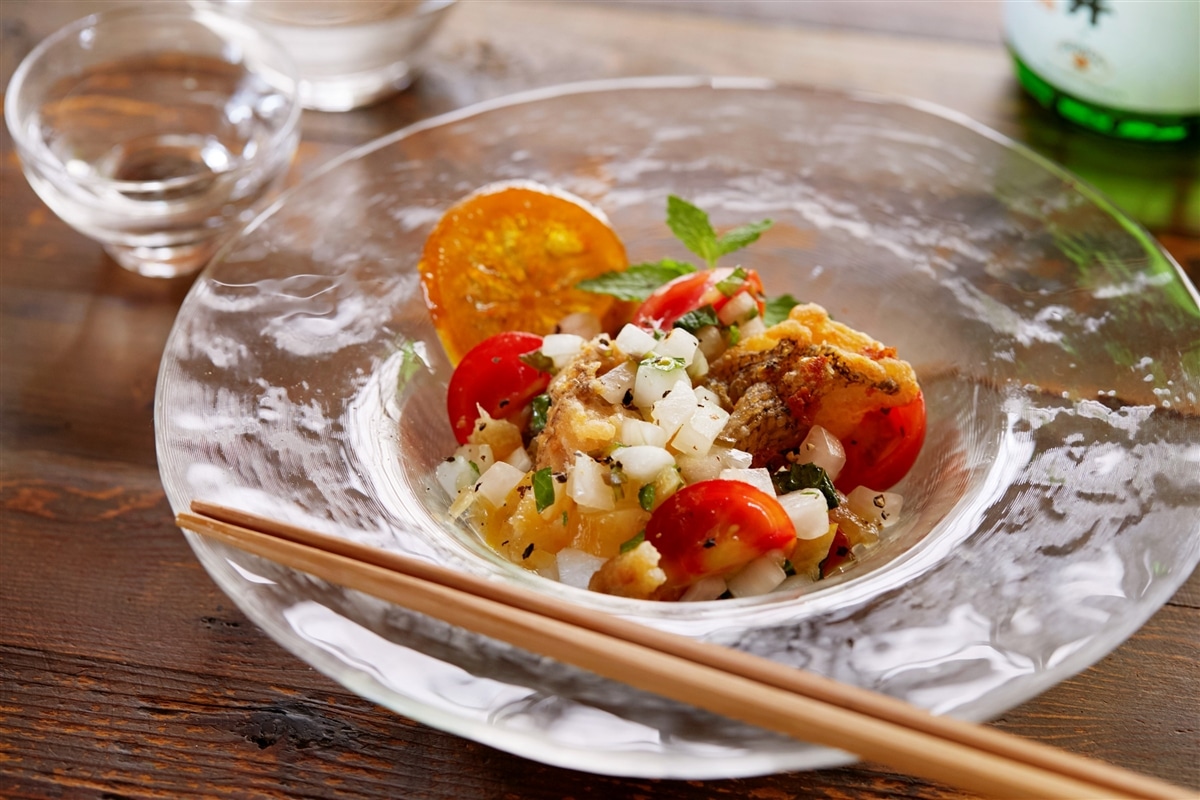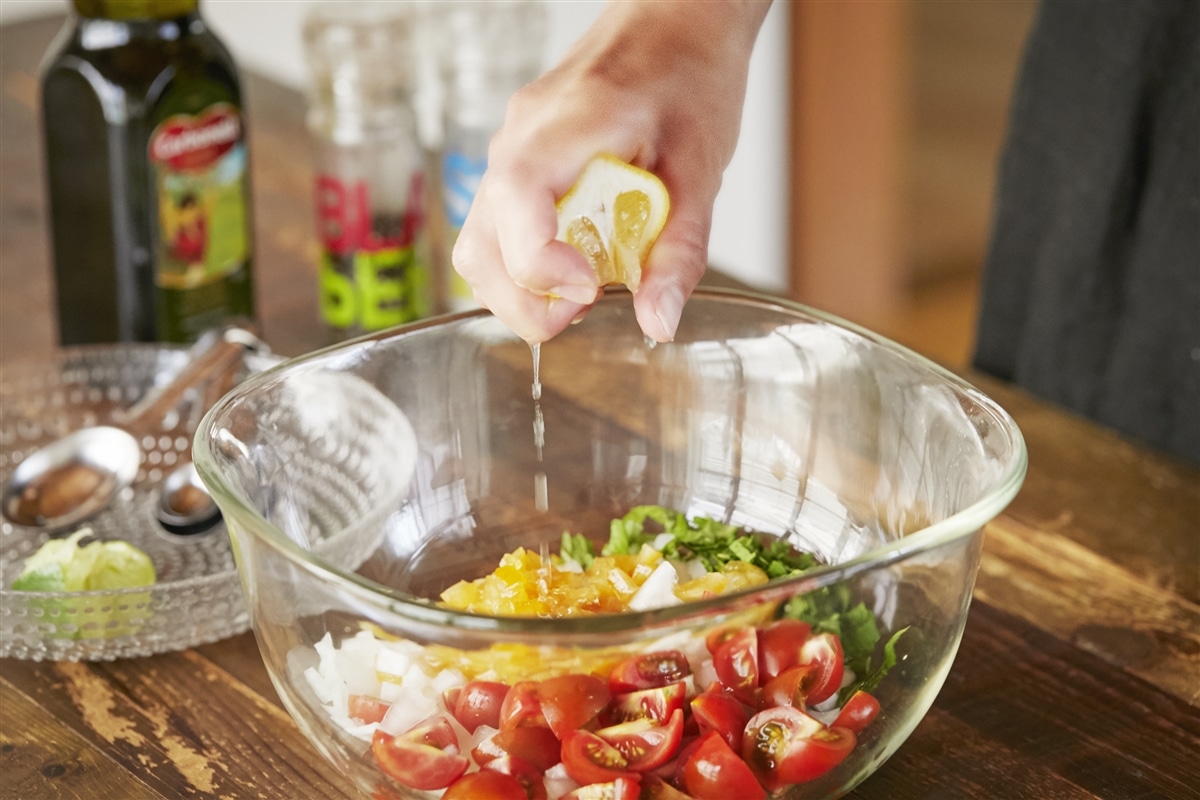 水気をよく切った新玉ねぎ、ミニトマト、レモンのコンフィチュール、レモン果汁、ライム果汁、オリーブオイルを混ぜ合わせ、揚げた白身魚を入れて塩で味を整える。