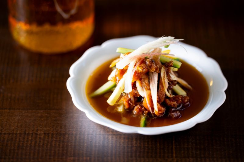 ① 茗荷、キュウリは千切りにして合わせ、10分ほど水にさらしてよく水気を切る