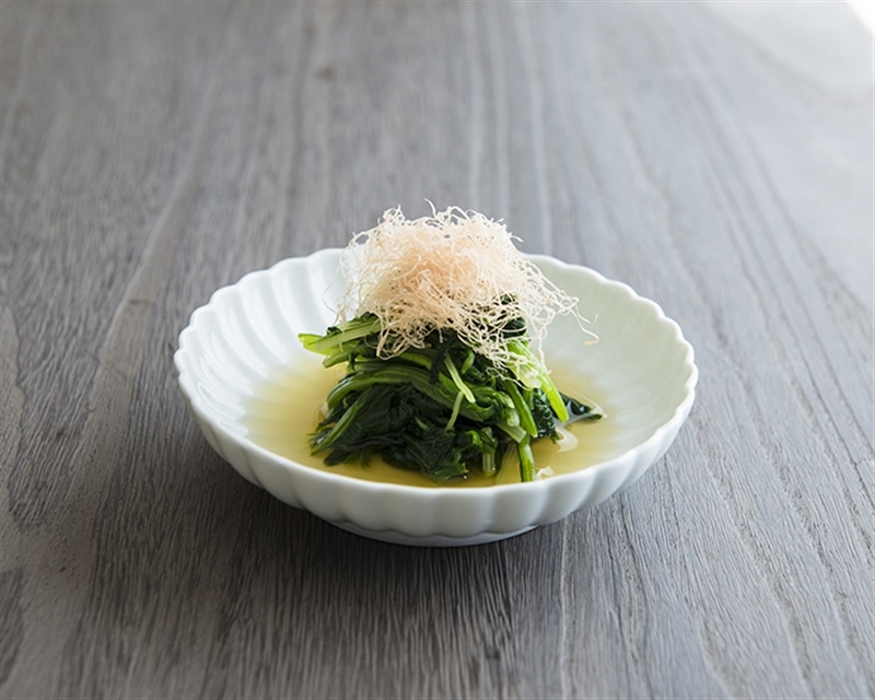 「アコメヤの出汁」(焼きあご・かつお・野菜・煮干し・鶏節・まぐろ)の中から、今回はかつお出汁を使ってご家庭でも簡単にほんものの味をお楽しみいただける、“ほうれん草と水菜のお浸し”のレシピをご紹介します。 「かつお出汁と青菜の相性を味わう」 簡単にできる、日本の食卓に欠かせない副菜であるお浸し。 ほうれん草をはじめとする青菜は、かつお出汁との相性がとても良く、 出汁が塩分控えめなので野菜の持つ旨みをより引き出します。 最後にかつおの削り節で、彩りを添えて。