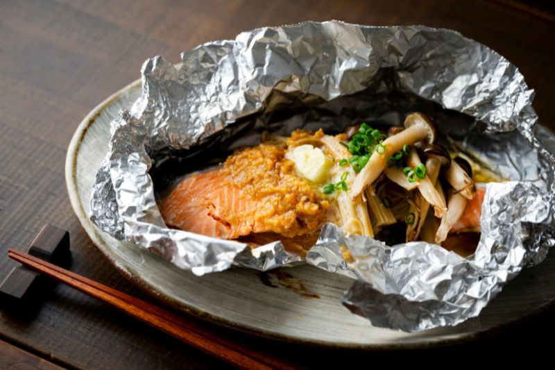 ③大きめにカットしたアルミホイルに秋鮭、しめじ、えのきをのせ、①のタレをのせて包む。