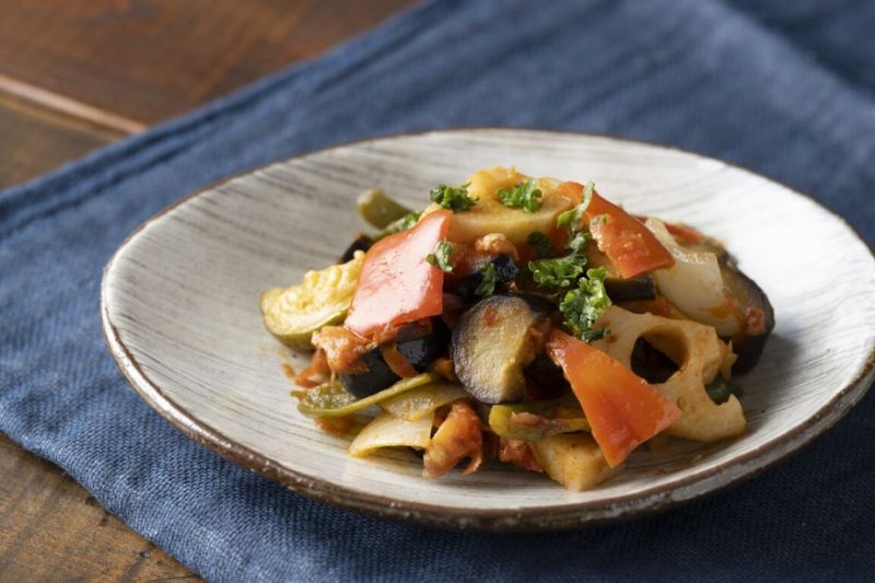 ①野菜はよく洗い、蓮根はイチョウ切り、トマト以外はさいの目切りにする。