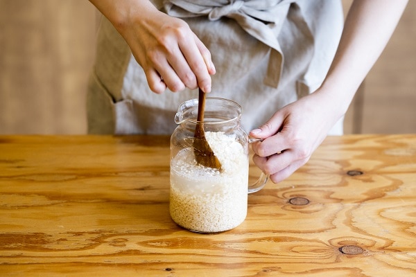 3.フタをして常温に置き、1日1回清潔なスプーンで混ぜて、4日~1週間程度、米麹が柔らかくなったら出来上がり。