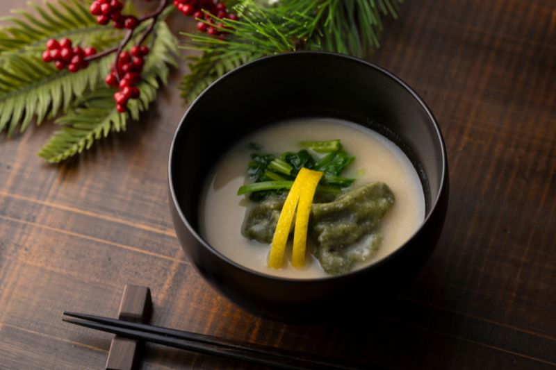 ④お椀に①の餅、ほうれん草を盛って③を注ぎ、水気を切った柚子の皮を飾ってできあがり。
