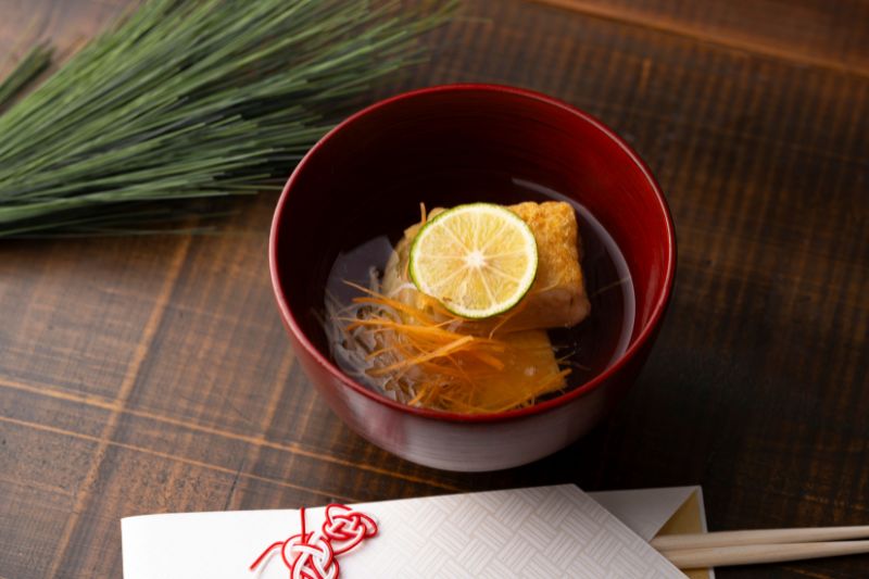 ③お椀に①の餅巾着、人参と大根を盛り、②を注ぐ。