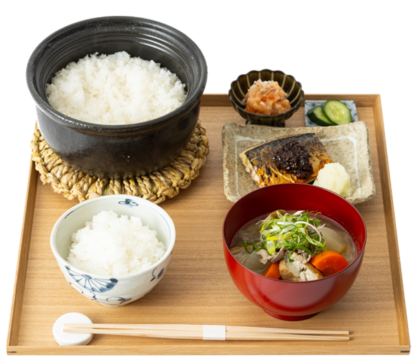 店舗で取り扱いの商品を使用した具沢山の豚汁やごはんのお供を季節の料理、こだわりのぬか漬けとともにお愉しみください。